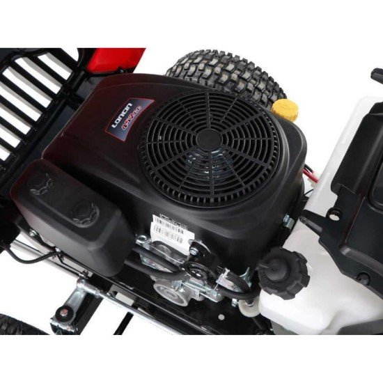 Šis sodo traktoriukas turi hidrostatinę transmisiją, kuri leidžia patogiai pedalu valdyti greitį tiek pirmyn, tiek atgal. Peiliai paleidžiami tiesiog mygtuko paspaudimu per elektromagnetinę sankabą.