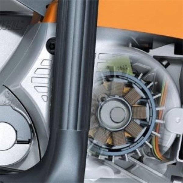 STIHL elektrinis variklis (EC): Elektroniniu būdu valdomas STIHL elektrinis variklis (EC) veikia be anglinių šepetėlių, mechaniškai beveik nedyla, o daug didesnis nei įprastinių elektrinių variklių naudingumo koeficientas atitinka visus lūkesčius. Todėl akumuliatoriaus energija optimaliai paverčiama galia.